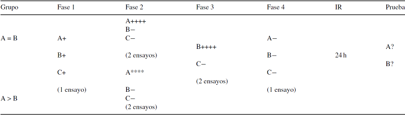 A partir de un diseño con animales similar al empleado en este experimento (A = B), Rescorla (2004) sugiere que la recuperación de información no depende solo del paso del tiempo después de la extinción sino de la recencia de la experiencia aprendida. De acuerdo con esta idea, lo que se aprendió durante la adquisición (fases 1, 2 y 3) y la extinción (fase 4) sigue estando intacto, y el rendimiento o recuperación es una función de la eficiencia relativa de cada experiencia, tal y como sugiere la RPT (Devenport, 1998). Los resultados obtenidos se ajustan a las predicciones de la RPT, ya que en el grupo A = B, donde se presentó igual magnitud de reforzamiento en las fases 2 y 3, la proximidad temporal de la extinción (fase 4) en relación con cada una de las experiencias de entrenamiento es la variable más importante (fases 1, 2 y 3). Pero al variar la magnitud de la consecuencia, como ocurrió en el grupo A > B, no solo es importante la proximidad de la extinción, sino también la magnitud de la consecuencia. Adicionalmente los resultados son coherentes con otros estudios realizados con niños preescolares (Alvarado et al., 2012, Strempler-Rubio et al., 2015) que han sido interpretados a partir de la RPT.