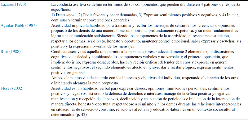 Existen diferentes definiciones de la asertividad, como se muestra en la Tabla 1; desde el punto de vista etimológico, aserción proviene del latín assertio-tionis, que es la acción y efecto de afirmar una cosa, o defender (Robredo, 1995).
