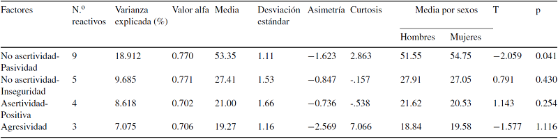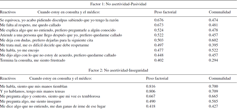 Se obtuvieron 4 factores claros: El primer factor se nombró No asertividad-Pasividad, pues describe al paciente en interacción con el médico con conductas como encogerse en la interacción, quedarse callado, no defender sus derechos, no preguntar sus dudas, disculparse al hablar, sentirse frustrado. Este factor es congruente con la definición que ofrece Aguilar-Kubli (1987) de la comunicación no asertiva refiriendo que es la forma de expresión débil de los propios sentimientos, creencias u opiniones que al no responder a los requerimientos de la situación interpersonal que se enfrenta permite que se violen los derechos de las personas. Por otra parte, el factor de comunicación no asertiva-pasiva concuerda con las escalas de Flores (1994) de Asertividad para empleados y estudiantes pues dentro de sus medidas tiene factores denominados No asertividad. Este fue el único factor en el que se encontraron diferencias significativas por sexo. Se observó que las mujeres tienen significativamente mayor tendencia a la No asertividad-Pasividad, y esto se relaciona con lo expresado por Flores y Díaz-Loving (2002); retomando razones culturales, plantean que las capacidades asertivas de los individuos dependen en gran medida de la educación y es frecuente que en algunos hogares se alienten los comportamientos pasivos en las niñas y agresivos en los niños.