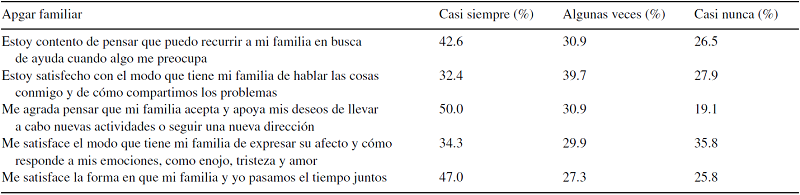La técnica para la recolección de datos fue la entrevista personal. En ella se aplicaron 2 instrumentos. Para captar la funcionalidad familiar se aplicó el cuestionario de Apgar familiar, construido por Smilkstein (1978), el cual fue traducido al español, validado y utilizado por diversos autores en el contexto latinoamericano (Santos Céspedes et al., 1997, Constanza Cañón et al., 2011, Forero Ariza et al., 2006, Toro et al., 2009). Es un cuestionario de 5 preguntas que explora el impacto de la función familiar sobre el comportamiento y la salud del individuo. Se puntúa en una escala de tipo Likert. Las puntuaciones de cada uno de los reactivos se suman y se define como familia muy funcional cuando alcanza un score entre 7 y 10 puntos; una familia moderadamente disfuncional entre 4 y 6 puntos y una familia con grave disfunción con un score entre 0 y 3 puntos.