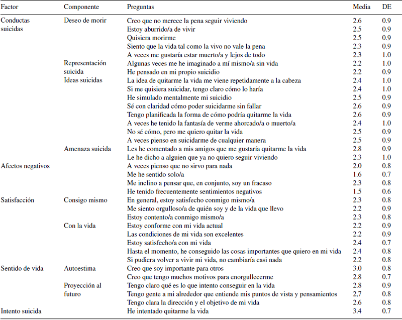 Conductas suicidas, 17 aseveraciones que evalúan los componentes: deseo de morir, representaciones suicidas, ideas suicidas y amenaza suicida.
