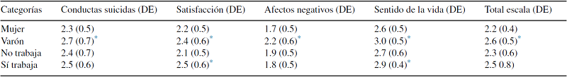 Las mujeres evidenciaron mayor riesgo en las 4 subescalas y en la escala total, con relación a los varones. Además, el hecho de que el paciente trabaje implicó un puntaje de menor riesgo de suicidio en las subescalas que involucran la satisfacción y el sentido de vida (Tabla 3). Finalmente, la cantidad de suicidios que los pacientes reportaron correlacionaron de forma negativa con la dimensión «conductas suicidas», es decir, que a mayor cantidad de intentos de suicidio, mayor riesgo reportado en esta dimensión de la escala (r = −0.26, p < 0.05).