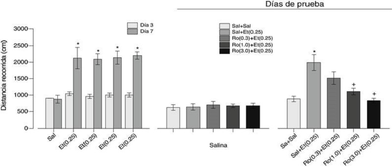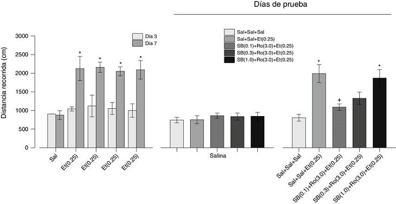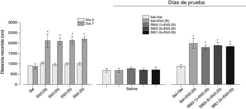 Para analizar la sensibilización locomotora inducida por etanol se cuantificó la distancia recorrida en centímetros (media ± EEM) en las diferentes fases de la investigación. En la fase del desarrollo de la sensibilización locomotora se utilizó un ANOVA factorial 2 × 5 de medidas repetidas con efectos principales de días (día 3 vs. día 7; la medida repetida), grupos y la interacción días × grupos. En las fases de prueba o retos farmacológicos, se utilizó un ANOVA de un factor. Los ANOVA aplicados en cada fase fueron con datos independientes de los mismos grupos que corresponden a las diferentes fases del experimento. Para las comparaciones a posteriori de los resultados que mostraron diferencias significativas en los ANOVA se utilizó la prueba de Tukey (p < 0.05).