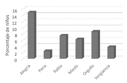 Al analizar las emociones de manera específica, se observó una diferencia estadísticamente significativa en la intensidad facial de la emoción de rabia (F(1, 4) = 13.33, p = .022), indicando que los niños representaban la rabia con su cara con mayor intensidad que las niñas, y una tendencia con la misma dirección para la intensidad facial del miedo (F(1, 2) = 16 p = .06). No se observaron diferencias estadísticamente significativas en las emociones de alegría, miedo, pena, orgullo y vergüenza.