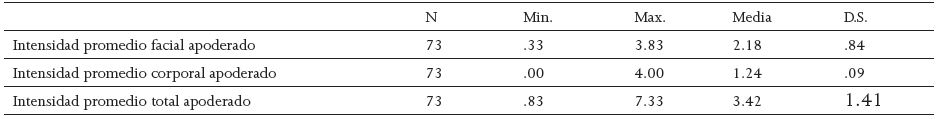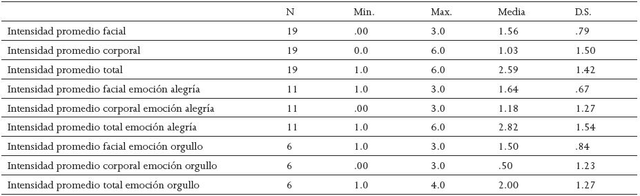 En cuanto a las emociones de alegría y orgullo -las cuales fueron analizadas por separado del resto de las emociones puesto que fueron las más representadas y ambas poseían similitudes en su expresión- se observó que la intensidad facial promedio de alegría fue de 1.64 (D.S. = 0.674) comparada con una intensidad facial promedio de orgullo de 1.50 (D.S. = 0.837). La intensidad corporal promedio de alegría fue de 1.18 (D.S. = 1.168) y de 1.5 puntos (D.S. = 0.84) para orgullo. Finalmente, la intensidad total promedio de la alegría fue de 2.82 puntos (D.S. = 1.54), y para orgullo, de 2 puntos (D.S. = 1.27). Para ambos casos, se observó que las intensidades faciales y corporales eran más bien sutiles y similares en su promedio. En el caso de la intensidad total, se pudo apreciar que esta era mayor en el caso de la alegría, pero igualmente homogénea respecto del orgullo (Ver Tabla 1).