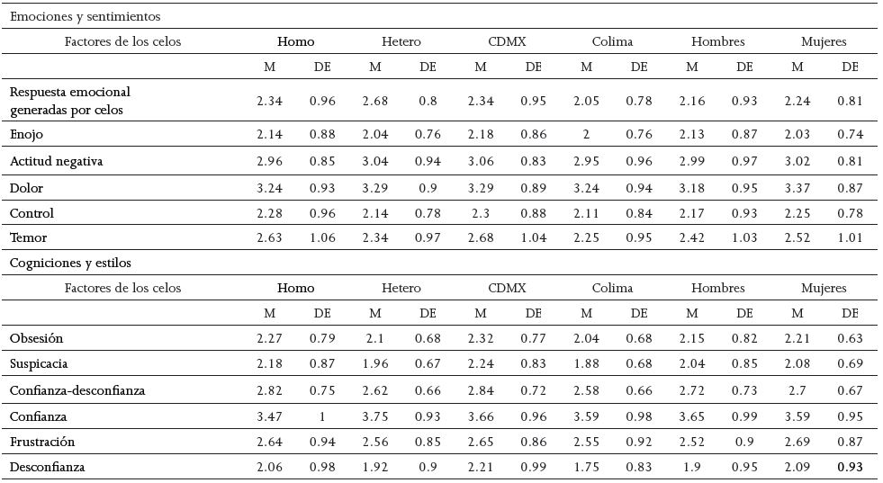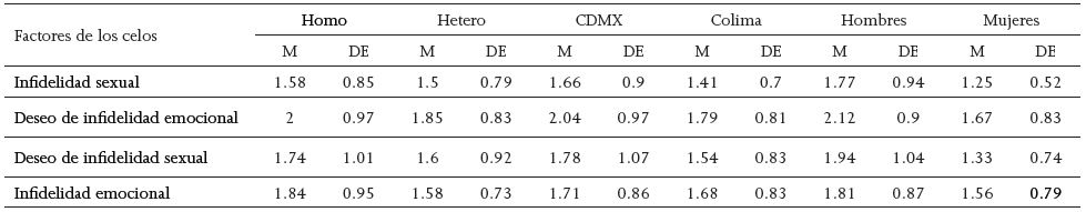En primer lugar se presentan las medias y desviaciones estándares obtenidas por cada uno de las variables estudiadas. Los resultados obtenidos para la Escala Multidimensional de los Celos, en la dimensión de emociones y sentimientos, muestran que tanto para las personas homosexuales como heterosexuales, el factor dolor es el que obtiene la media más alta (Homosexuales M=3.24, Heterosexuales M=3.29). Lo mismo sucede para el caso de las personas originarias de la Ciudad de México y de Colima (Ciudad de México M=3.29, Colima=3.24), y para el caso de los hombres y las mujeres (Hombres M=3.18, Mujeres M=3.37). Asimismo, para dimensión de cogniciones y estilos, es en la dimensión de confianza donde tanto los homosexuales y heterosexuales (Homosexuales M=3.47, Heterosexuales M=3.75), como los de la Ciudad de México y de Colima (Ciudad de México M=3.66, Colima M=3.59) obtuvieron la media más alta. Lo mismo ocurre con los hombres y mujeres (Hombres M=3.65, Mujeres M=3.59) de la muestra (ver Tabla 1).