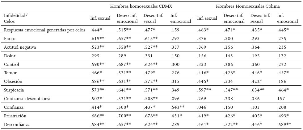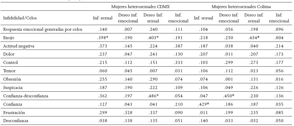 Para el caso de las mujeres heterosexuales originarias de la Ciudad de México se obtuvo una relación entre el factor de los celos y el enojo, con la infidelidad sexual y el deseo de infidelidad sexual. También correlacionó la confianza-desconfianza con el deseo de infidelidad sexual. En cambio para las mujeres heterosexuales de Colima, se encontraron tres correlaciones diferentes, la primera dada entre el factor del enojo con el deseo de infidelidad sexual. La segunda, es la relación entre la confianza-desconfianza y el deseo de infidelidad emocional. Y tercera, la correlación entre la confianza y la infidelidad sexual (ver Tabla 6).