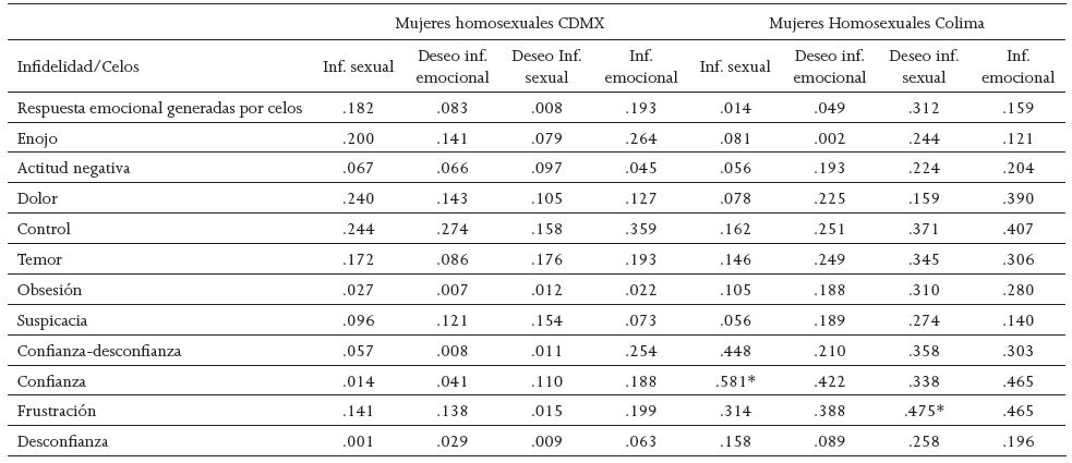 Para el caso de las mujeres homosexuales originarias de la Ciudad de México no se encontraron correlaciones entre los diversos factores de los celos y las dimensiones de la infidelidad. Por el contrario, para las mujeres homosexuales de Colima solo se encontró correlaciones significativas entre la confianza y la infidelidad sexual; y la frustración con el deseo de infidelidad sexual (ver Tabla 4).