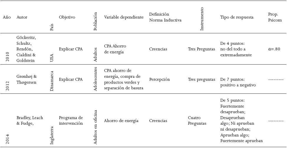 Las investigaciones presentadas en la Tabla 1, tienen por objetivo explicar la Conducta Proambiental (CPA), definiendo la norma inductiva como creencia, sólo la investigación de Grønhøj y Thøgersen del 2012 la retoma como percepción, lo cual es más apropiado en el niño por el nivel de comprensión que posee; en los dos estudios más recientes no presentan las características psicométricas de los instrumentos.