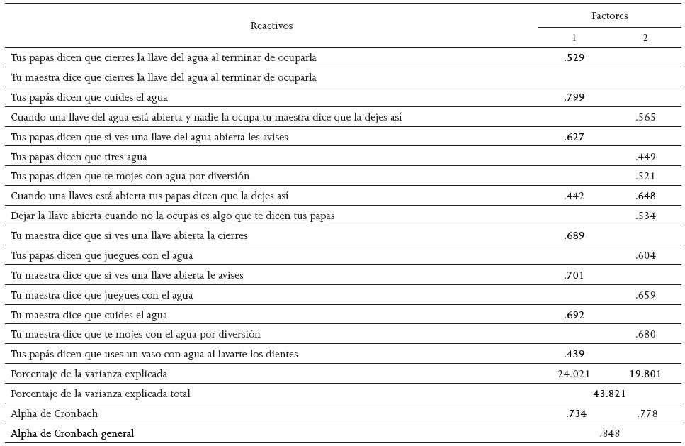 El análisis factorial ortogonal de componentes principales en la extracción inicial arrojo dos factores, el primero con diez reactivos, en su mayoría compuesto por acciones a favor de un ahorro de agua y el segundo con nueve reactivos enfocados en acciones de derroche del recurso. No obstante se tuvieron que eliminar tres reactivos por incongruencia conceptual.