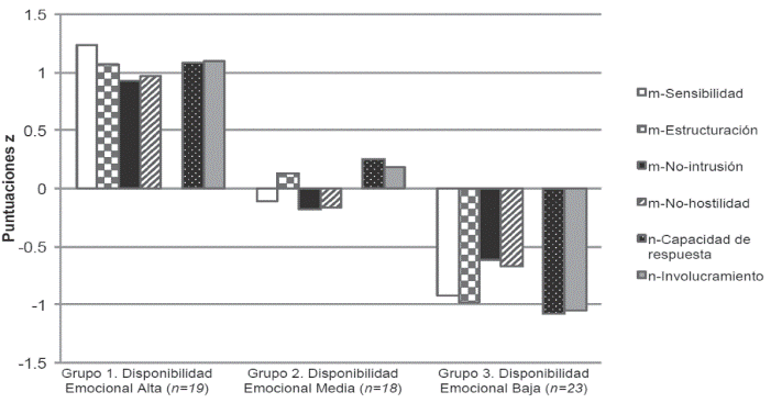 Para conseguir una interpretación global de la disponibilidad emocional se identificaron tres patrones de interacción con diferente nivel de funcionamiento de la díada. Al comparar los problemas de los niños entre los patrones de disponibilidad emocional, se identificaron diferencias significativas entre los grupos de alta y baja disponibilidad emocional en cuanto al nivel de Aislamiento, de Problemas internalizados, y del Total de problemas. Concretamente, en el patrón de baja disponibilidad emocional, los niños tenían mayor riesgo para el desarrollo de síntomas internalizados y de aislamiento.