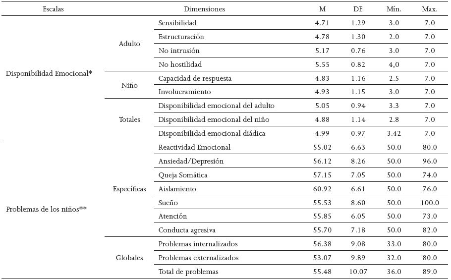 Escala de Disponibilidad emocional (The Emotional Availability [EA] Scales, Infancy and Early Childhood Version, 4th edition (Biringen, 2008). Es un instrumento observacional que evalúa la calidad de la interacción entre un adulto y un niño. La versión empleada, diseñada para niños de 0 a 5 años de edad, está integrada por cuatro dimensiones para el adulto: Sensibilidad o capacidad del adulto para atender, percibir y responder oportunamente a las señales emocionales y conductuales del niño; Estructuración o capacidad del adulto para fomentar o apoyar la exploración del niño, así como para establecer límites; No-intrusión o grado en que el adulto es capaz de mantenerse disponible sin interferir con la autonomía del niño; No-hostilidad o grado de expresión manifiesta o encubierta de impaciencia, agresividad e ira en el adulto. También está integrada por dos dimensiones para el niño: Capacidad de respuesta (Responsiveness) del niño engancharse emocional y conductualmente con los intentos de interacción del adulto; e Involucramiento o grado en que el niño toma la iniciativa para incluir al adulto en la interacción. Cada una de las dimensiones se evalúan en una escala de 1 “no óptima” a 7 “muy óptima”. El empleo de la escala exige al evaluador el prerrequisito de completar un entrenamiento específico y la obtención de una certificación. En el presente estudio los videos fueron codificados por dos jueces debidamente entrenados y certificados que eran ciegos a los niveles de problemas de los niños. Con el 30% de los videos, seleccionados aleatoriamente, se obtuvo el índice de acuerdo a partir del Coeficiente de concordancia intra-clase (Intra-class Correlation Coefficient [ICC]; Shrout & Fleiss, 1979) con el método Combinado Bidireccional de acuerdo absoluto. Los índices de concordancia entre observadores fueron elevados para las dimensiones de Sensibilidad (.94), Estructuración (.92), Capacidad de respuesta (.95) e Involucramiento (.94). Para las dimensiones de No-Intrusión y No-Hostilidad se obtuvo el porcentaje de acuerdo (No-Intrusión, 95% y No-Hostilidad, 90%), en vez de ICC debido a que los puntajes se concentraron en un rango reducido. Tanto los ICC como los porcentajes de acuerdo fueron altos, lo que confirmó la fiabilidad de los puntajes.
