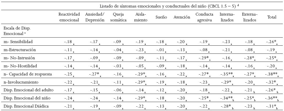 En la Tabla 2 se presentan las correlaciones entre la escala de Disponibilidad Emocional (Biringen, 2008) y el CBCL 1.5-5 (Achenbach & Rescorla, 2000). Las dimensiones globales de ambas escalas cumplieron el presupuesto de normalidad, por lo que su asociación se exploró mediante el coeficiente de Pearson; para el resto de las subescalas se utilizó el coeficiente de Spearman. Los datos muestran una relación significativa y negativa entre la Sensibilidad materna y el Total de problemas de los niños; así mismo, la No intrusión de las madres se asoció significativa y negativamente con las Conductas agresivas, la Externalización y el Total de problemas de los niños. También, la Capacidad de respuesta se asoció significativa e inversamente con la Ansiedad, el Aislamiento, las Conductas agresivas, los Problemas internalizados, los Problemas externalizados y el Total de problemas de los niños. Así mismo, el Involucramiento se vinculó inversa y significativamente con el Aislamiento, la Internalización y el Total de problemas.