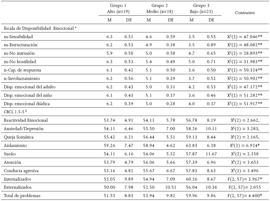 El grupo 1 o de disponibilidad emocional alta se conformó por 19 díadas (11 niñas y 8 niños; 32% del grupo total). En general las madres respondieron a las señales y comunicaciones de sus hijos, brindaron apoyo y guía durante la interacción sin llegar a mostrarse intrusivas y regularon sus emociones negativas. Los niños también manifestaron un alto funcionamiento, respondieron con entusiasmo a la interacción con sus madres y mostraron interés en involucrarlas (ver Tabla 3). El grupo 2 o de disponibilidad emocional media se formó por 18 díadas (9 niñas y 9 niños; 30% del grupo total). Las madres mostraron algunas inconsistencias en su respuesta a las señales y comunicaciones de sus hijos, y aunque por lo general regularon sus emociones negativas, se observaron ligeros indicios de impaciencia o aburrimiento. Los niños de este grupo respondían a los intercambios con sus madres, aunque lo hacían con un tono afectivo más neutral que entusiasmado. El grupo 3 o de disponibilidad emocional baja se conformó por 23 díadas (8 niñas y 15 niños; 38% del grupo total). Las madres manifestaban dificultades para identificar y responder adecuadamente a las comunicaciones de sus hijos, así como para guiar o poner límites adecuados. Por su parte los niños mostraron cierta tendencia a la evitación y poco interés en la interacción con sus madres.