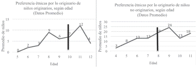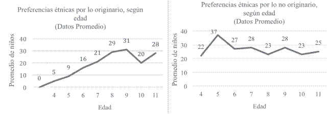 Con respecto a la etnicidad, se pudo evidenciar que tanto los niños de origen indígena como mestizos o de origen europeo, manifiestan inicialmente (entre los 4 y 7 años) preferencias por los estímulos no originarios. Las explicaciones de este hecho han sido discutidas por varios autores (véase por ejemplo Aboud, 1988; Morland, 1966; Phinney, 1990; Quintana, 1993, 1998; Roth & Villegas, 2015), argumentando que dicha tendencia, en apariencia universal, podría estar influenciada por los valores de la cultura dominante.