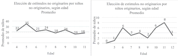 Otro parece ser, sin embargo, el caso de los niños no originarios u originarios a la hora de elegir estímulos no originarios. Esta tendencia adopta un patrón diferente que consiste en elecciones relativamente invariantes entre los 4 y los 12 años. Esta invariancia podría deberse a que, reconocer un atributo personal favorable en un estímulo familiar, puede ser una cosa natural no sujeta a aprendizajes sociales o acomodos cognitivos demasiado complejos, por lo que esta tendencia estaría presente en todo momento.