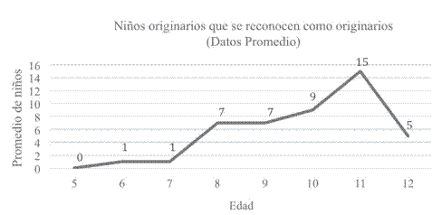 Los resultados obtenidos muestran que la formación del auto-reconocimiento sigue patrones similares a los encontrados en las preferencias ya descritas. Tratándose de los niños de origen indígena, el reconocimiento de sus características étnicas sigue una curva ascendente y sostenida desde los 4 o 5 años hasta aproximadamente los 11, para luego caer a niveles cerca de los iniciales. Estos resultados corresponden a la muestra total (n = 77), de niños originarios (véase Figura 5).