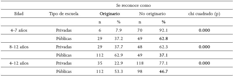 La Tabla 1 permite, asimismo, advertir las proporciones de concentración de niños que se reconocen como originarios en relación con los que no lo hacen, dependiendo del tipo de unidad educativa a la que pertenecen. Nótese la diferencia a favor de los niños menores de 8 años que se reconocen como originarios, en escuelas públicas (37.2%) y privadas (7,9%). Tales diferencias persisten en el grupo de niños mayores de 7 años. Los resultados nos hacen pensar en la influencia ejercida por los pares que comparten características físicas, sociales y culturales en el auto-reconocimiento con respecto a su grupo étnico de pertenencia.