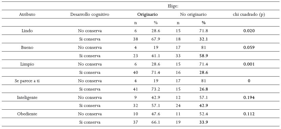 Los resultados totales incluyen las tres ciudades bolivianas y muestran una clara relación entre la tendencia de los niños indígenas/originarios a elegir estímulos no originarios y la ausencia de habilidades de conservación. Tres de los ocho atributos medidos arrojaron, a través del cálculo de la Chi Cuadrado, datos consistentes con nuestra suposición (p < .05), uno estuvo muy cerca (p < .059) y dos no fueron significativos. Como puede confirmarse en la Tabla 2, “lindo”, “bueno”, “limpio” y “se parece a ti”, muestran proporciones mayores de preferencia por el exogrupo; no obstante, “inteligente” y “obediente” no se comportaron según lo esperado.