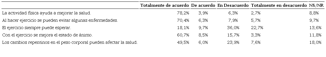 Actividad física y tiempo libre: Respecto a la actividad física, en el municipio de Campo de la Cruz se observa una marcada tendencia hacia creencias desde las que se identifican los beneficios de dicha práctica en el desarrollo, cuidado y sostenimiento de la salud (ver Tabla 2).