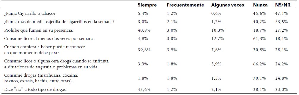 Asimismo, en el caso del licor y el cigarrillo se evidencian mayores porcentajes de consumo, no obstante, para la comunidad, ambas sustancias no se asumen como focos de problemas en la misma al identificarse como parte de la cotidianidad e idiosincrasia de sus habitantes. Aun así, como indica la Tabla 1, los participantes mantienen una actitud dirigida a evitar el consumo y el abuso de sustancias en general, con la mayoría de los participantes respondiendo que evitan tanto el alcohol como el cigarrillo (61,3% y 45,6% respectivamente, respondiendo que nunca consumen) y las drogas (70,1%).