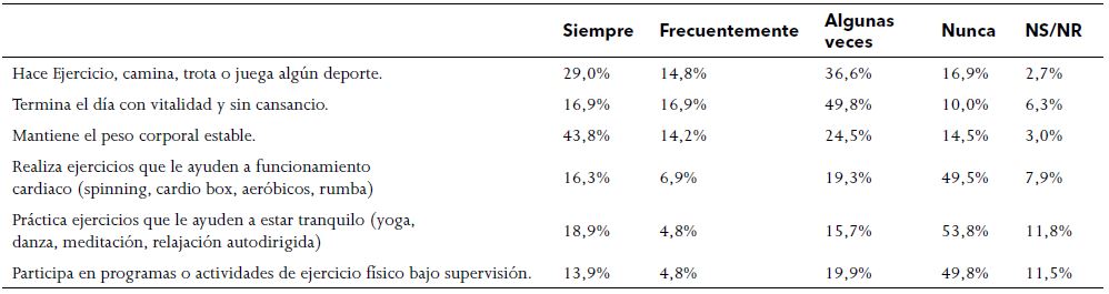 Sin embargo, en lo que respecta a las prácticas de este grupo de actividades, sólo el 29,0% de los encuestados afirma practicar actividad física regularmente, con un 14,8% que lo hace con menor, pero aún notable, frecuencia. Aquí, las principales actividades físicas practicadas por los sujetos se relacionan con ejercicios aeróbicos, como rumbaterapia y danza (42,5% entre las opciones algunas veces a siempre). En menor medida se registran actividades relacionadas con prácticas de relajación (39,4 % entre las opciones algunas veces a siempre) (ver Tabla 3). En este punto cabe resaltar que al aludir a ejercicios cardiovasculares, los habitantes tienden a asociarlos a la realización de caminatas y al uso de bicicletas para desplazarse cotidianamente en su municipio, y no con una intención dirigida explícitamente al mantenimiento de la salud. En el caso de actividades relacionadas con aeróbicos y rumba, estas usualmente son orientadas por el instructor del programa gubernamental para la promoción de actividad física.