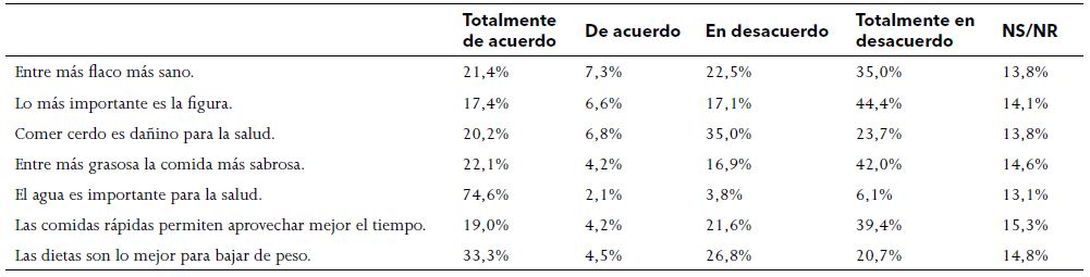 Nutrición: Las Tablas 4 y 5 ilustran las creencias y prácticas existentes entre los sujetos de la muestra en términos de hábitos alimenticios. En este punto se destaca el reconocimiento de las ventajas que generan los adecuados hábitos de nutrición; no sólo relacionados con el consumo de alimentos sino también con la preparación de los mismos, y el consumo de agua. Todos ellos como factores protectores que se constituyen como una base para la potenciación de estados saludables en el individuo (ver Tabla 4). Al respecto, un 74,6% de los habitantes insiste en la importancia del consumo de agua para la salud, al mismo tiempo que reconocen los peligros del exceso de grasas, evidenciado en un 42,0% que no está de acuerdo con la presencia de grandes cantidades en los alimentos, y un 39,4% en desacuerdo con la comida rápida como una alternativa alimentaria que requiere menos tiempo.