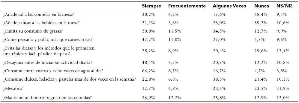 Si bien las creencias en hábitos alimenticios se ubican en rangos favorables en función del mantenimiento de la salud, en lo que respecta a las prácticas de nutrición se identifica que menos del 50% de los sujetos asegura no utilizar sal y azúcar en los alimentos cuando están los alimentos (ver Tabla 5). Asimismo, el 34,5% sólo limita algunas veces su consumo de grasas, mientras que el 12,7% asegura no limitar esta práctica. Por otro lado, se evidencia prácticas coherentes con estilos de vida saludable, entre ellas se destaca que el 48,4% de los sujetos desayuna diariamente, el 47,2% favorece el pescado y el pollo como carnes alternativas a la carne de res, y el 66,2% consume entre cuatro y ocho vasos de agua al día.