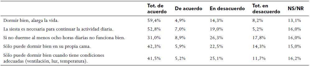 Sueño: Haciendo alusión a la variable sueño, y de manera similar a los resultados obtenidos en las variables anteriores, se identifican creencias coherentes con estilos de vida saludable desde los cuales se favorece el sueño como uno de los factores que contribuye a la salud de los individuos (ver Tabla 6).