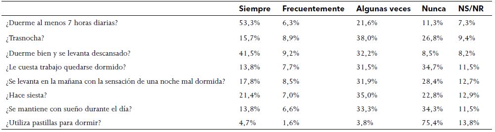 En el marco de esta variable, sin embargo, se resaltan prácticas que requieren indagarse con mayor profundidad para su mayor fortalecimiento. Esto teniendo en cuenta que sólo el 50,9% de los sujetos duerme bien y se levanta descansado, frente a un 32,2% a quienes sólo les sucede a veces. De manera similar el 31,9% de los sujetos se levanta con la sensación de haber dormido mal algunas veces, en contraste con un 28, 4% a quienes nunca le sucede y un 17,8% quienes afirman que esta sensación siempre está presente (ver Tabla 7).