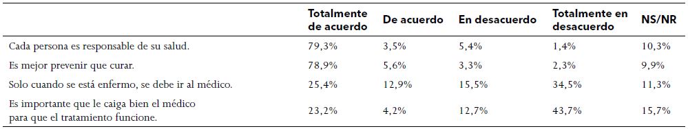 Aún ante los resultados frente al rol del individuo en el mantenimiento de la salud mediante prácticas de autocuidado, al valorar las prácticas que favorecen la salud en los seres humanos, se encuentra que un 79,3% de los sujetos considera al individuo mismo como responsable de su propia salud, resaltando la prevención como una opción para potenciar la salud (78,9% de los sujetos) (verTabla 9). Sin embargo, es posible observar discrepancias en torno al rol del médico en el mantenimiento de la salud; un 34,5% considera importante visitar al médico con regularidad, frente a un 25,4% que prefiere ir solo cuando se encuentran enfermos.