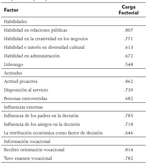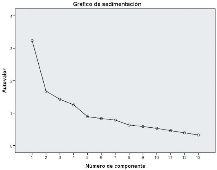 Dados los autovalores en el gráfico de sedimentación, se identifican los factores (Fig. 1) en el punto de inflexión de la línea que los une. Resultan 4 factores con un 58.4% de varianza explicada mediante el método de componentes principales, los cuales se nombran: habilidades, actitudes, influencia externa y orientación vocacional (Tabla 4) con cargas factoriales correspondientes a cada ítem.