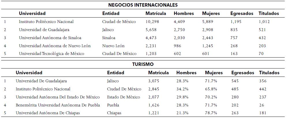La estadística de matriculación para las profesiones de NIN y TUR en México (Tabla 1) refleja la alta demanda que tiene el Instituto Politécnico Nacional (IPN) y la UdeG. Se identifica también en ambas universidades públicas un comportamiento similar en términos de género, al ser más o menos equilibrado en NIN a diferencia de la carrera de TUR con mayor demanda por mujeres.