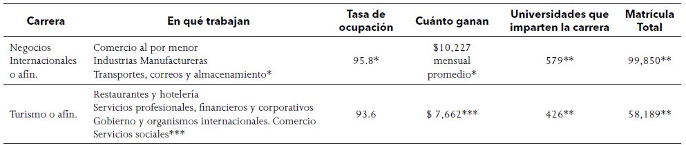 Asimismo de acuerdo con el observatorio laboral (Tabla 2), la carrera de NIN o Comercio Internacional es más demandada que TUR y carreras afines a ella en el país. Ambas presentan una tasa de ocupación superior al 90%. Por su parte, los egresados de TUR presentan mayor variabilidad en el ámbito laboral, que va desde los servicios turísticos hasta oficinas de gobierno y organismos sociales, a diferencia de los egresados en NIN. Otra característica diferenciadora en ambas carreras es el salario promedio mensual más alto para la carrera de NIN que la de TUR.