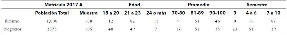 En la muestra se consideraron estudiantes de tercer semestre en adelante debido al conocimiento curricular que tienen de la carrera elegida. El procedimiento para aplicar el instrumento consistió en preguntar, en diferentes aulas de clase en el CUCEA, si eran estudiantes de tercer semestre en adelante. Cabe señalar que en las aulas asisten estudiantes de todas las carreras que oferta el centro universitario (dado el sistema de créditos). La aleatoriedad consistió en aplicar el instrumento y captar, de cada salón (siguiendo una técnica de muestreo por conglomerados) la respuesta de alumnos pertenecientes a las carrera de NIN y TUR durante el mes de mayo del calendario escolar 2017 A. El muestreo aleatorio, da cuenta de la cobertura de la población estudiantil en diferentes niveles de desempeño académico con promedios bajos, medios y altos.