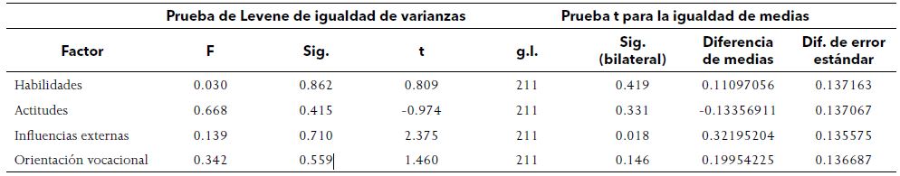 Una vez que se identificaron los factores que caracterizan a la población estudiantil de ambas carreras en términos de habilidades, actitudes, influencias externas y orientación vocacional, se procede a realizar pruebas de diferencias en ambos grupos con la prueba t de Student para muestras independientes (Tabla 5) con el propósito de caracterizar cada grupo de estudiantes.