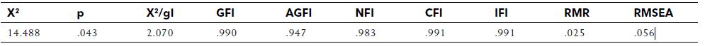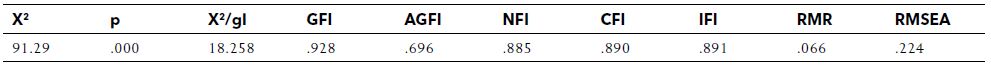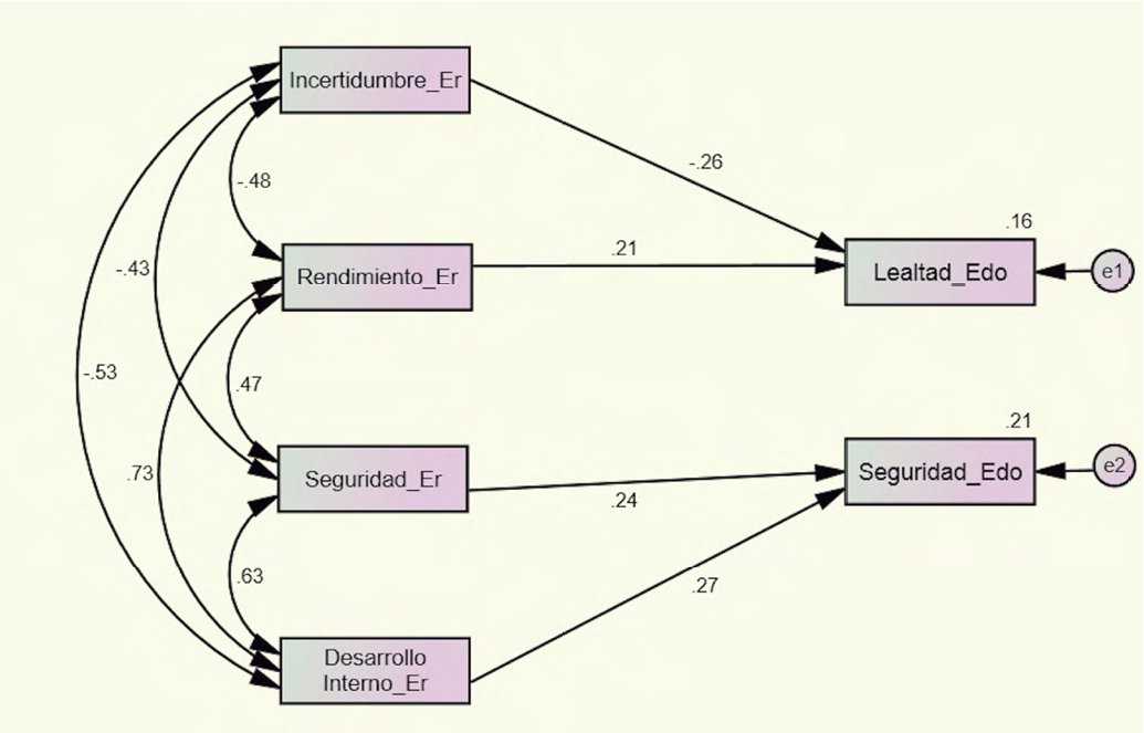Posteriormente, se especificó un modelo Path para probar de manera simultánea las creencias de obligaciones de Lealtad y Seguridad del empleado como variables dependientes, y las creencias de obligaciones del empleador como variables independientes. Por un lado, el modelo (Figura 2) indica que la Incertidumbre sobre el empleador con una relación inversa (b = -.26) y las creencias sobre las condiciones de Rendimiento que proporciona el empleador (b = .21), son las variables independientes que predicen la Lealtad del empleado (R2 = 16%). Por otro lado, el modelo indica que las creencias sobre el Desarrollo Interno (b = .27) y la Seguridad del empleo (b = .24) que proporcione el empleador, son las variables independientes que predicen la Seguridad del empleado (R2 = 21%) de continuar en ese empleo. Todas las variables independientes mostraron correlaciones significativas entre ellas. Los indicadores de bondad de ajuste del modelo (Tabla 4) muestran resultados de ajuste (GFI, NFI, CFI, IFI y RMR), aunque algunos de ellos presentan niveles que pueden ser mejorados (X2, X2/gl, AGFI y RMSEA).