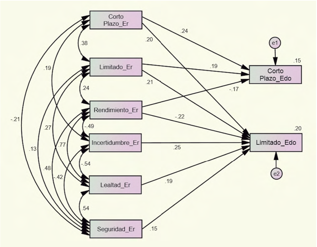 Enseguida, se especificó un modelo Path para poner a prueba de manera simultánea las creencias de obligaciones de Corto Plazo y Limitadas del empleado como variables dependientes y las creencias de obligaciones del empleador como variables independientes. Las seis variables independientes mostraron una relación significativa predictiva sobre la perspectiva Limitada del empleado (R2 =20%); mientras que solo tres variables independientes mostraron una relación significativa predictiva sobre la perspectiva a Corto Plazo del empleado (R2 = 15%). Las creencias de que el empleador proporciona las condiciones necesarias para el Rendimiento fue el factor (variable independiente) que mostró una relación predictiva significativa inversa tanto sobre las creencias de Corto Plazo del empleado (Corto Plazo_Edo) como sobre una perspectiva Limitada del empleado (Limitado_Edo) (Figura 3), lo que indica que a menores creencias de que el empleador proporciona las condiciones adecuadas para el desempeño mayores las creencias del empleado de hacer lo mínimo por lo que le pagan y quedarse lo menos posible en ese empleo. Al evaluar el ajuste del modelo se identificó que la mayoría de los índices de bondad de ajuste se encontraron dentro de los parámetros aceptables, por lo que se puede concluir que el modelo tiene un buen ajuste que puede ser mejorado (Tabla 7).