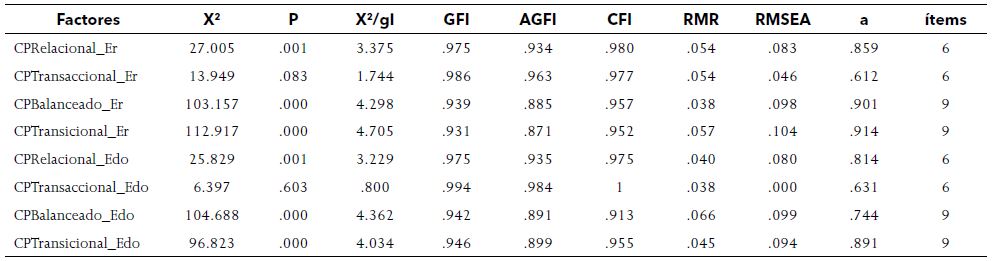 Se utilizó la adaptación al castellano del Inventario de Contrato Psicológico (ICP), que mide las subescalas de Orientación Relacional (12 ítems), Orientación Transaccional (12 ítems), Orientación Balanceada (18 ítems) y la Orientación Transicional (18 ítems) tanto para las creencias sobre el empleador como sobre el propio empleado (Alcover y Martínez-Íñigo, 2005; Rousseau, 2000). Para esta investigación, se realizó un análisis factorial confirmatorio (AFC) de las subescalas del ICP con la muestra indicada (Lévy y Varela, 2006). En la Tabla 1 se observa que los índices de bondad de ajuste de las subescalas del ICP aportan evidencia de validez de constructo y los índices de Alpha de Cronbach indican niveles aceptables de consistencia interana que van de .612 a .914.