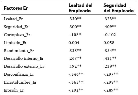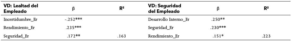 Con base en la identificación de correlaciones significativas entre los diferentes factores de la orientación relacional (Tabla 2), se realizaron análisis de regresión lineal múltiple (Tabla 3). Respecto a la Lealtad del empleado (variable dependiente), el análisis arrojó tres variables independientes que mostraron una relación predictiva significativa, con un coeficiente de determinación de 16.3% que que indica que la variación en la Lealtad del empleado se explica por estas tres variables; por un lado, la Incertidumbre sobre las intenciones del empleador (Incetidumbre_Er) mostró la relación con mayor nivel predictivo (b = -.252) con una relación inversa, lo que implica que a menor incertidumbre sobre las intenciones y compromiso del empleador mayor lealtad del empleado; enseguida, tanto las creencias de que el empleador proporcione las condiciones para el Rendimiento (Rendimiento_Er) (b = .235), como la Seguridad del empleo que proporcione el empleador (Seguridad_Er) (b = .172) mostraron una relación positiva significativa, lo que implica que a mayores creencias de que el empleador proporciona las condiciones necesarias para el rendimiento en el trabajo y que a mayor creencia de que el empleador proporciona seguridad y estabilidad del empleo, mayor lealtad del empleado. Por otro lado, respecto a la Seguridad del empleado (variable dependiente), el análisis arrojó tres variables independientes que mostraron una relación predictiva positiva significativa, con un coeficiente de determinación de 22.3% que que indica que la variación en la Seguridad del empleado se explica por estas tres variables; en primer lugar, el Desarrollo Interno del empleador (Desarrollo Interno_Er) (b = .250), que implica mayor creencia de que el empleador proporciona desarrollo interno a los empleados; en segundo lugar, la Seguridad del empleador (Seguridad_Er) (b = .230), que implica mayor creencia de que el empleador brinda seguridad del empleo; finalmente, el Rendimiento del empleador (Rendimiento_Er) (b = .151), que indica mayor creencia de que el empleador proporciona las condiciones necesarias para el rendimiento en el trabajo; lo que implica que a mayor Desarrollo Interno, Seguridad del empleo y condiciones para el Rendimiento, mayor la seguridad del empleado de continuar su relación con ese empleador.