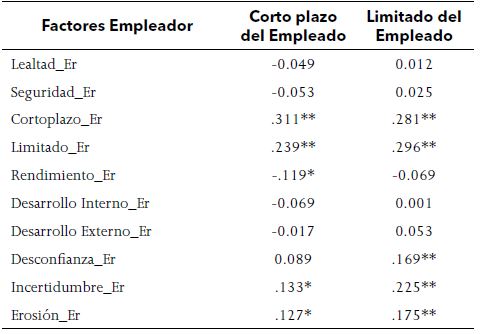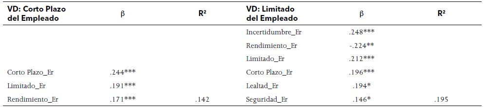 A partir de la identificación de correlaciones significativas entre los diferentes factores de la orientación transaccional (Tabla 5), se realizaron análisis de regresión lineal múltiple (Tabla 6). Respecto a la perspectiva a Corto Plazo del empleado (variable dependiente), el análisis arrojó tres variables independientes que mostraron una relación predictiva positiva significativa, con un coeficiente de determinación de 14.2% que indica que la variación en el Corto Plazo del empleado se explica por estas tres variables; en primer lugar, un planteamiento de Corto Plazo por parte del empleador (Corto Plazo_Er) (b = .244), que implica mayores creencias de que el empleador solamente mantendrá una relación a corto plazo; en segundo lugar, un planteamiento Limitado por parte del empleador (Limitado_Er) (b = .191), que se refiere a implicación limitada del empleador, poca o nula capacitación y desarrollo; y en tercer lugar, que el empleador proporcione las condiciones de Rendimiento (Rendimiento_Er) (b = .171). Por otro lado, respecto a una postura del empleado de realizar solamente un Limitado conjunto de actividades (variable dependiente), es decir, lo mínimo por aquello que le pagan, el análisis arrojó seis variables independientes que mostraron una relación predictiva significativa con un coeficiente de determinación de 19.5% que indica que la variación en lo Limitado del empleado se explica por estas seis variables independientes (Tabla 3).