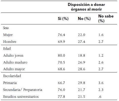 Como se muestra en la Tabla 1, hubo un mayor porcentaje de hombres que de mujeres que declararon no estar de acuerdo en donar sus órganos (x 2 = 6.1, gl=2, p<.05). En cuanto a la edad de los participantes, hubo más adultos (maduros o mayores) que jóvenes que no estarían dispuestos a donar(x 2 =12.08, gl=4, p<.02). Con respecto a la escolaridad, hubo más participantes con estudios solamente de primaria que no estarían dispuestos a donar (x 2 =15.11, gl=4, p<.005).