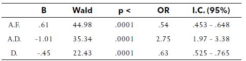 En la Tabla 2 se muestran los resultados de la regresión, utilizando los puntajes de los factores del ADOP como predictores de la disposición a donar órganos. Los tres factores resultaron significativos, y la mayor razón de momios (OR por sus siglas en inglés -odds ratio-) se observó en el factor de Actitudes Desfavorables. Los participantes que tuvieron mayores puntajes en este factor tuvieron 2.75 veces menos probabilidad de estar dispuestos a donar sus órganos al morir.
