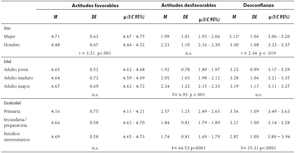 Al comparar los resultados de los factores del ADOP, la prueba post hoc mostró diferencias significativas en los puntajes de los tres factores (F = 1709, gl = 2, 894, p < .0001). Las puntuaciones más altas se encontraron en el factor Actitudes Favorables (M=4.65, DE=.64), seguidas del de Actitudes de Desconfianza (M=3.20, DE=1.07), y finalmente del de Actitudes Desfavorables (M=2.05, DE=.1.05). El tamaño del efecto fue grande (η 2 = 1,13).
