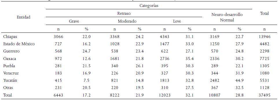 La Tabla 1 presenta la prevalencia de las categorías de neurodesarrollo por entidad federativa. La condición de neurodesarrollo Normal se encontró en el 28.8% del total de la muestra, el retraso leve del neurodesarrollo ocurrió en el 32.1%, mientras que el retraso moderado afectó a 21.9% y el grave a 17.2%; la suma de estos dos últimos fue de 39.1% y se consideró retraso de alto riesgo. El retraso grave se presentó en mayor medida en el estado de Guerrero (24.7%), Chiapas (22.0%) y Puebla (21.5%). La categoría Normal tuvo un mayor porcentaje en los estados de Yucatán, Veracruz y Oaxaca (Chi Cuadrada = 1643.4, p < .001).