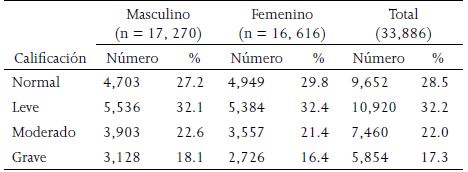 La prevalencia del neurodesarrollo en niños de 11 a 13 meses de edad total y por género se distribuyó de la siguiente manera. La condición de normalidad estuvo en el 28.5% del total, esto es, solamente 9,652 menores de los 33,866 que participaron en el estudio. El retraso leve del neurodesarrollo ocurrió en el 32.1% del total, mientras que el retraso moderado afectó a 22.0% y el grave a 17.2%. La condición de normalidad fue mejor para el género femenino que para el masculino (29.8% vs 27.2%). El retraso leve se presenta muy similar por género (femenino 32.4% vs masculino 32.1%), mientras que el retraso moderado y grave es más frecuente en los del género masculino (22.6% vs 21.4% y 18.1% vs 16.4%, respectivamente). Las diferencias entre los distintos porcentajes para cada una de las categorías son altamente significativas (Chi Cuadrada = 39.431, p < .001). El retraso leve tuvo la mayor prevalencia. (Tabla 2).