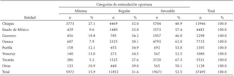 La prevalencia de estimulación oportuna Favorable se presentó en el 52.5%, la estimulación Regular ocurrió en el 31.6% de todos los menores, mientras que la Mínima se dio en 15.9%. Los estados donde se encontraron los porcentajes más altos de estimulación Favorable fueron: Yucatán (67.3%), Oaxaca (62.0%) y Estado de México (57.4%); y los porcentajes más altos en la categoría de estimulación Mínima fueron: Chiapas (27.1%), Guerrero (19.8%) y Veracruz (13.0%) (Chi cuadrada= 2804.5 p<.001) (Tabla 3).