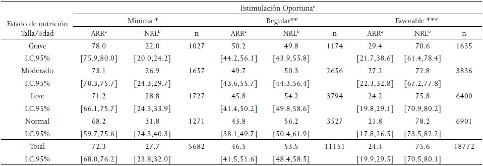También nuestros hallazgos resaltan de manera importante, cómo las pautas de estimulación oportuna y el déficit de talla, se asocian con el neurodesarrollo. Los niños con estimulación Mínima tienen un mayor porcentaje de ARR, incluso cuando tienen un estado de nutrición normal. Los niños estimulados favorablemente son Normales y Riesgo Leve (NRL), y el porcentaje aumenta en la medida que el estado de nutrición mejora. Se ha demostrado que las oportunidades de aprendizaje temprano en el hogar son de indiscutible importancia para el desarrollo del niño (Walker, 2011). El retraso en el crecimiento es ya un factor bien establecido para los resultados adversos del desarrollo neurológico (Grantham-McGregor, 2007).