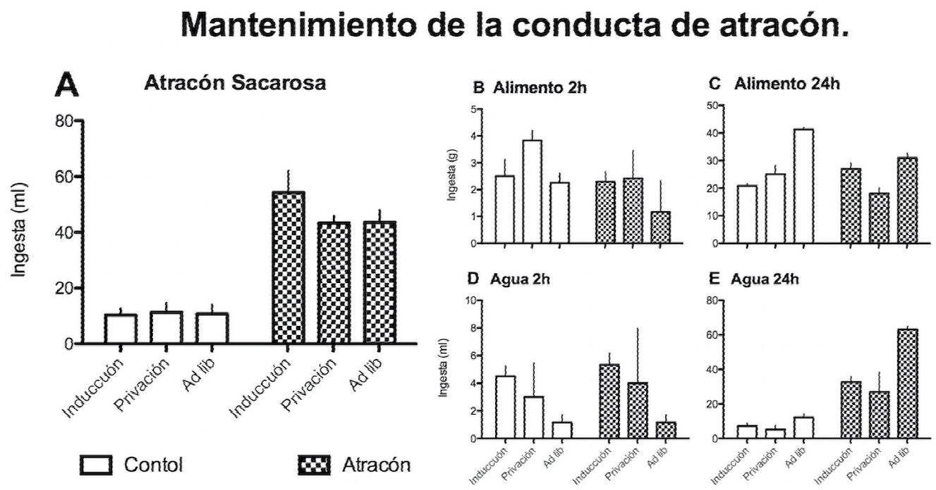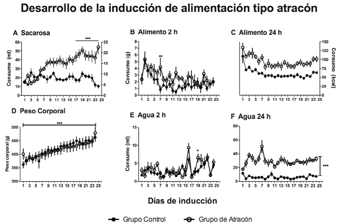 Los resultados muestran que el grupo que tuvo acceso restringido a la solución de sacarosa 2 h al día fue escalando el consumo conforme transcurrieron los días de entrenamiento; en los últimos días del entrenamiento, el consumo de sacarosa fue notablemente superior al grupo que tuvo acceso libre a la sacarosa. El incremento en el consumo de sacarosa fue acompañado por un incremento en el consumo de agua pero, a pesar de estos cambios, no hubo diferencias significativas en el peso corporal entre los grupos. El hallazgo más significativo es que a pesar de que transcurrieron 15 días entre cada una de las 8 evaluaciones posteriores realizadas a lo largo de 2 meses, el grupo experimental continuó manifestando la conducta de atracón (tal y como la presentó al final del entrenamiento) y, además, esta conducta se presentó independientemente de si las ratas tuvieron acceso libre o restringido al alimento.