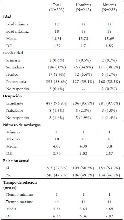 Para cumplir con el objetivo, participaron voluntariamente 503 adolescentes, con una edad entre 12 y 18 años (M = 15.71; DE = 1.79); 215 hombres (42.7%) y 288 mujeres (57.3%). En cuanto a la ocupación, predominaron los estudiantes (96.8%); principalmente de bachillerato (57%) o secundaria (36.4%). Los participantes declararon haber tenido por lo menos una relación de noviazgo en su vida (M = 4.05; DE = 2.79); sin embargo, al momento de contestar el instrumento, 263 participantes (52.3%) estaban en una relación de noviazgo (109 hombres; 154 mujeres), mientras que los otros 240 no (47.7%) (106 hombres; 134 mujeres). Fueron seleccionados a través de un muestreo no probabilístico, accidental. El resto de los datos sociodemográficos pueden observarse en la Tabla 1.
